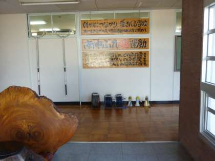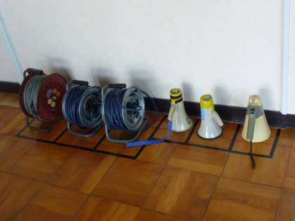 職員室前廊下の一角に、拡声メガホンと電工ドラム(延長コード)が常置されました。各色の係生徒が、必要に応じここから持っていきます。