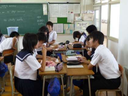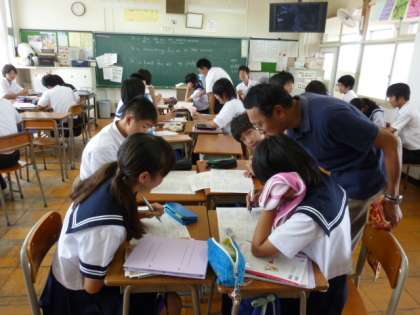 今日の授業「3年2組 英語」 公開日 2010/09/07 更新日 2010/09/07 授業の様子 9月7日(火)4時間目の授業です。 Unit4が終了し、まとめのプリントに取り組んでいます。教師のチェックをうけ、班の中で教え合う姿が見られました。