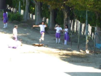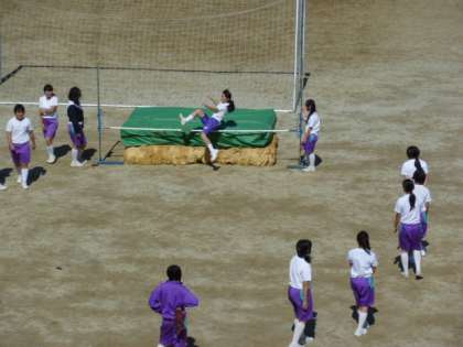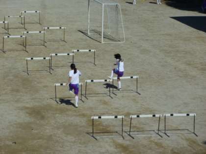 女子は、陸上競技の授業で、走り高跳び、走り幅跳び、ハードルに取り組んでいました。