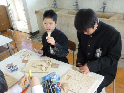 今日の授業「1年3組 美術」 公開日 2010/12/14 更新日 2010/12/14 授業の様子 12月14日(火)2時間目の授業です。 生き物を形どった「ジグソーパズル」も完成した生徒が増えてきました。 ほとんどの生徒が、仕上げのペーパー磨きをしていました。
