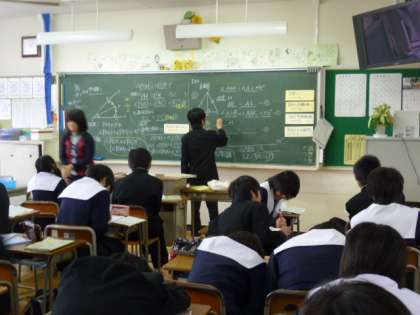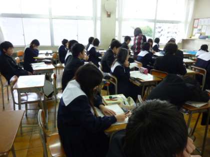 今日の授業「2年5組 数学」 公開日 2010/12/15 更新日 2010/12/15 授業の様子 12月15日(水)3時間目の授業です。 「図形の証明」の授業です。指名された生徒が、黒板で演習問題を解いていました。