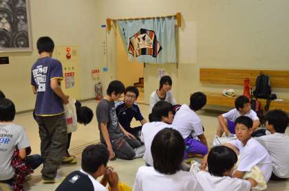 18:00〜18:50 全体を2グループに分けて入浴です。2グループ目が入浴を待っているところです。海水に浸った生徒が多く、出てきた生徒はさっぱり気持ちよさげでした。