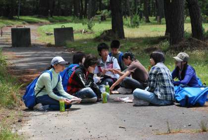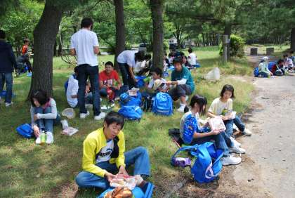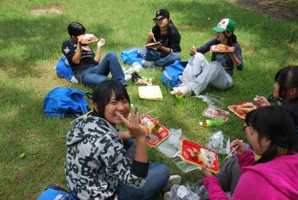 写真入手の関係で前後しますが、2日目の昼食は幕の内弁当です。1・2組はマウントハイクで山を越えて、3・4組はカッターで食見(しきみ)まで行った後です。特にカッターは、強い風と波の中疲れ切っていました。