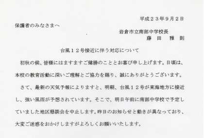台風12号接近により、今日から明日にかけて愛知県地方に強い風や雨が予想されるため、明日(9月3日)午前に予定されていた岩倉南部中地区の「地区懇談会」を中止します。