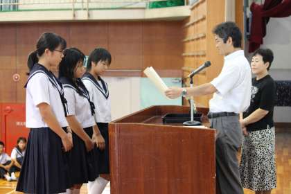 表彰伝達「柔道部女子」 公開日 2011/09/05 更新日 2011/09/05 南中 JUST NOW ! 本日(9月5日)の朝礼で、昨日行われた柔道大会の表彰伝達を行いました。 ●第59回浜北柔道大会 女子団体3位 柔道部女子の皆さん、おめでとう。新チームにとって、幸先のよいスタートとなりました。より高い目標に向かって頑張ってください。