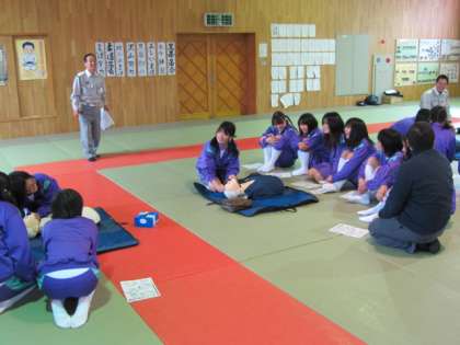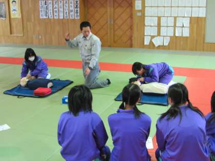 2年生 救命救急法講習 公開日 2012/01/20 更新日 2012/01/20 授業の様子 2年生が体育の授業の一環で、今日(1月20日)と1月23日の2日に分けて、救命救急法の学習を行います。 岩倉市消防署から講師の先生をお迎えし、人工呼吸法、心臓マッサージ、AEDの使い方を教えていただきます。緊急時には、初期の対応が大切です。中学生とはいえ救命救急のスキルを身につけているに超したことはありません。