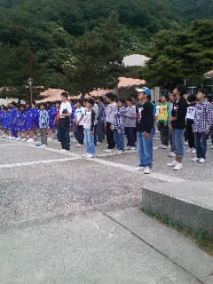 神戸の中学校と共に朝のつどいです。みんな少し眠そうです。でもいい交流ができました。