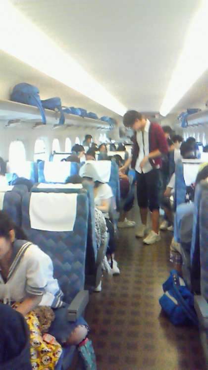 ただいま、新幹線は都会へ入ってきました。もう少しで新横浜です。30分遅れくらいでしょうか。