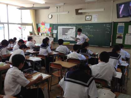 2年生社会科で鎖国の授業を行っていました。課題は、「はじめは貿易を進めていた幕府がなぜ外国との関わりを減らしていったのか?」です。黒板には、拡大された資料が貼られています。社会科は資料が命。プリントして配布してもいいのですが、わざわざ拡大して黒板に貼るというひと手間が大事です。生徒の視線をそろえることができます。授業の一体感は、資料の提示の仕方一つでも変わってくるのです。