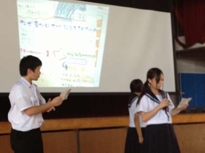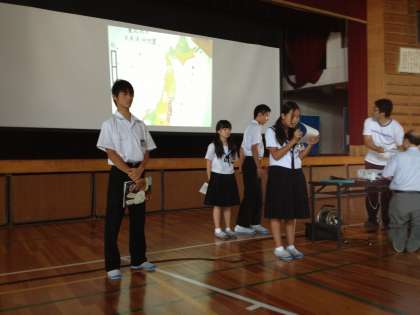 全校道徳 第1回震災学習 公開日 2013/07/09 更新日 2013/07/09 授業の様子 5時間目に全校生徒が体育館に集まり、震災学習を行いました。今週金曜日に映画監督の青池憲司さんをお招きして、門脇小学校で撮影した震災ドキュメンタリー映画のお話を聞きます。今日は、事前学習として、地震のメカニズム、津波の被害、原発の仕組みと事故の影響などについて、3年生の各学級の代表生徒が発表しました。最後に、当日歌う合唱の練習もしました。