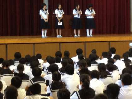 今日は、とてもさわやかな青空になりました。気持ちのよい朝です。そんな中、朝礼では、モンゴル派遣、広島派遣の報告がありました。彼らは、現地でそれぞれに貴重な体験をして帰ってきました。学校では感じ取れない何か、教科書では読み取れない何か、テレビでは伝わらない何かを、一人一人が学んできたと思います。それを学校で一つずつ仲間に伝えていってほしいと思います。