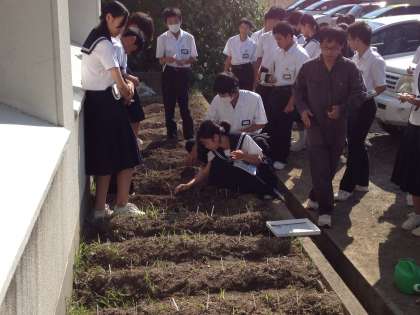 2年生の技術家庭科では、作物の栽培について学習します。今回は大根の種をまきました。敷地内に適した畑がなく、厳しい条件の中での学習です。今週植えた別の学級は、もう芽を出しているものがありました。大きく育つことを楽しみにしています。