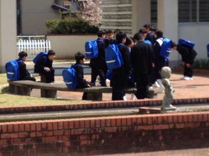 初々しい! 公開日 2014/04/07 更新日 2014/04/07 南中 JUST NOW ! 今日はまだ午前日程。下校時刻になって中庭に1年生が出てきました。少し大きな制服、型崩れしていないナップサックがとても初々しく見えます。