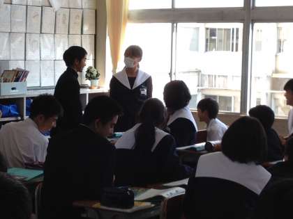 ペアで 公開日 2014/04/24 更新日 2014/04/24 南中 JUST NOW ! 教室から楽しそうな笑い声が聞こえてきたので覗いてみると、英語の授業でした。英語はコミュニケーションの技能を身につける教科。この日はペアでの会話を学んでいました。
