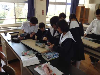 落下する物体の運動 公開日 2014/05/02 更新日 2014/05/02 南中 JUST NOW ! 理科の授業研究が行われました。落下する物体がどのように運動するのかを、記録タイマーという器具を使って実験する授業でした。記録されたテープを切り貼りしてグラフを作成し、そこから規則性を見つけ出す活動に、生徒は夢中になって取り組んでいました。