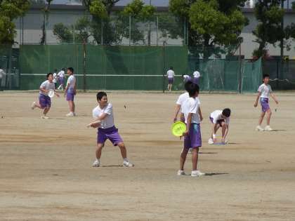 体育の授業でアルティメットディスクの練習をしていました。アルティメットディスクは、バスケットボールとアメリカンフットボールを合わせたような競技だといわれています。とっても楽しそうです。