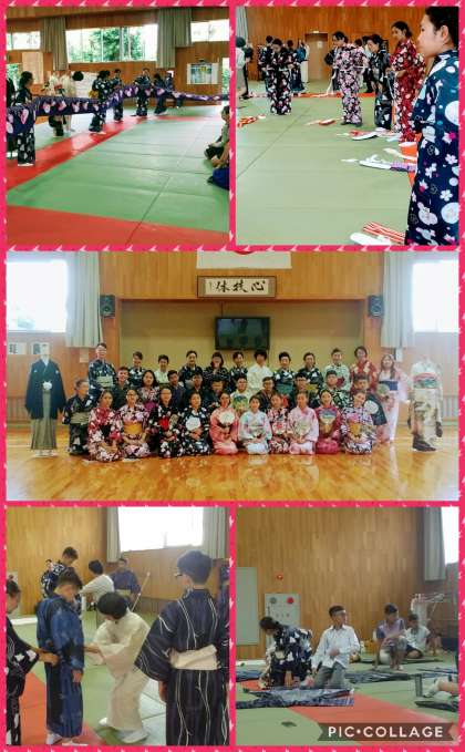 モンゴル生 着付け教室 公開日 2017/06/26 更新日 2017/06/26 南中校長室の窓 モンゴル派遣団の皆さんに、日本文化に触れる体験をしてもらおうと、「着付け教室」を行いました。 帯の結び方の複雑さに手こずりながらも、その美しさはもちろん、着心地のよさにも魅了されているようでした。 ご協力くださった装賀着物学院の皆様、本当にありがとうございました。