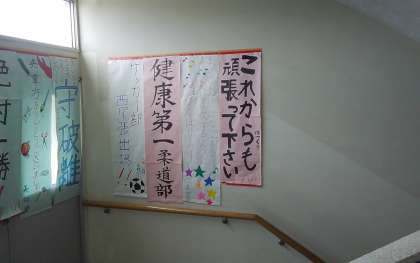 3年生の教室に向かう階段に、後輩たちからの激励メッセージが掲示されています。