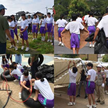 本日は明日の「水辺まつり」の準備のボランティアがありました。暑い中でしたが、チューブの空気入れやいかだの組み立て、テントの設営など意欲的に活動することができました。