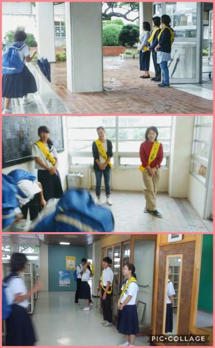 PTA朝のあいさつ運動 公開日 2017/09/28 更新日 2017/09/28 PTAより 中間テスト1日目です。 テスト当日は、PTAの委員さんたちが分担して、あいさつ運動に取り組んでくれています。 今日も雨の中登校してくる生徒たちを、温かく迎えてくださいました。