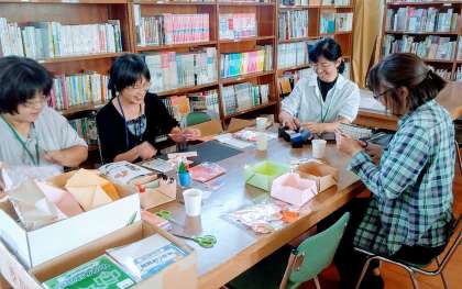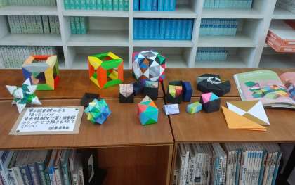 図書館の展示 公開日 2017/09/29 更新日 2017/09/29 南中校長室の窓 図書ボランティアサークル「クローバー」の皆さんが素敵な展示品を作ってくださいました。 昨年度同じような作品を展示したところ、それが数学の教科書で「立体図形」として紹介されていたものと同じで、生徒たちが大変興味をもって取り組んだとのことです。 今回はさらに力作揃いです。