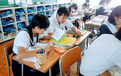 授業風景 3年生 英語 公開日 2017/10/11 更新日 2017/10/11 授業の様子 3年生 英語の授業風景です。 一枚の絵を見て、隣同士問題を出し合います。 もちろんAll Englishです。とても楽しそうです。