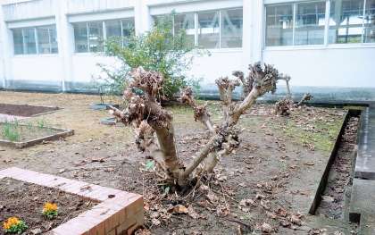 春をめざして 公開日 2017/11/20 更新日 2017/11/20 南中校長室の窓 例年以上に厳しい寒さが続いています。 夏に一気に枝を伸ばし、秋に美しい花を咲かせた中庭のスイフヨウも、その役目を終え、剪定されてさっぱりとした姿になりました。 花壇には先日紹介したパンジーが移植され始めました。 厳しい冬の始まりですが、花たちはすでに春をしっかり見据えています。