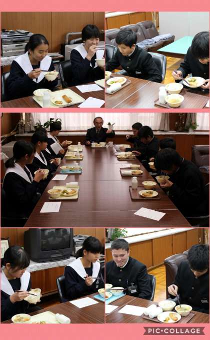 3年生 校長室での会食 公開日 2017/11/22 更新日 2017/11/22 南中校長室の窓 例年卒業が近づく頃から、「校長室での会食」会が行われます。 第1回の今日は3年1組 5・6組です。 これまでのこと、これからのこと・・・楽しくおいしく頂きました。