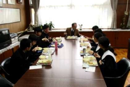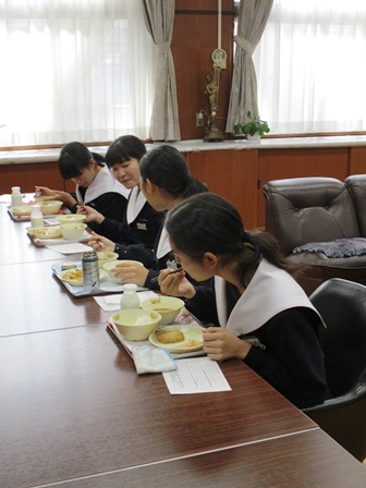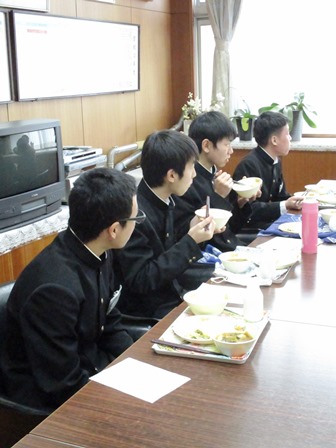 校長室での会食11 公開日 2018/01/11 更新日 2018/01/11 3年生 3学期はじめての「校長室での会食会」です。 「卒業後の新しい環境の中で、やっみたいことは?」 との問いに、ひとりひとり前向きな考えを語ってくれました。