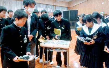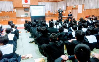 上級学校訪問報告会の後、場所を体育館から武道場に移し、江南警察署の方にご協力いただいて、薬物乱用防止教室を開催しました。危険ドラッグの危険性を描いたDVDを視聴し、薬物についての説明を受けて、危険な一歩を踏み出さない決意を確認しました。