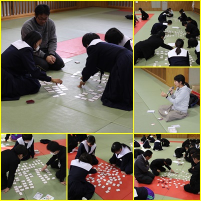 2年生 百人一首大会 公開日 2018/01/23 更新日 2018/01/23 2年生 本日6時間目、2年生が百人一首大会を開きました。 学級の違う3人が一組になり、先生たちが代わる代わる読み上げる歌を聞きながら、札を取り合います。一人一人が取った札の数をクラスごとに集計して、その合計を競い合います。 白熱した雰囲気で、会場は熱気に包まれていました。
