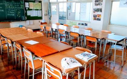 特別教室で授業が行われるため、給食用に机を合わせて移動をしたようです。