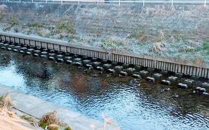 今朝の矢戸川の様子です。 冷たい川面をカモたちがゆったりと進んでいきます。