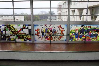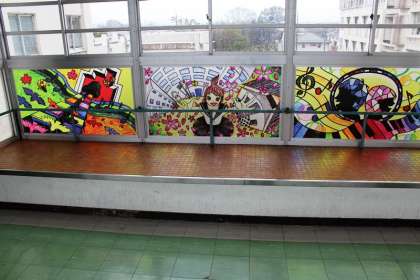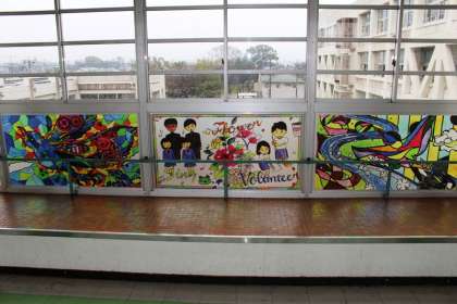 生徒作品をステンドグラス風に加工したものを、3階渡り廊下に設置してもらいました。