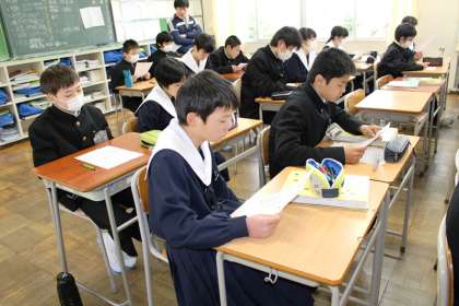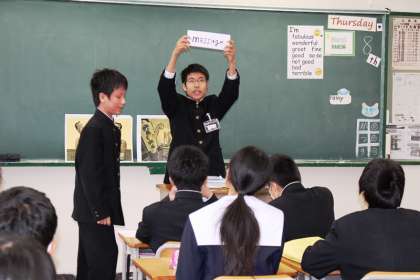 1年生 英語の授業風景です。 生徒が教壇に立って、授業を進める試みです。 みんな真剣に参加しています。
