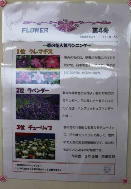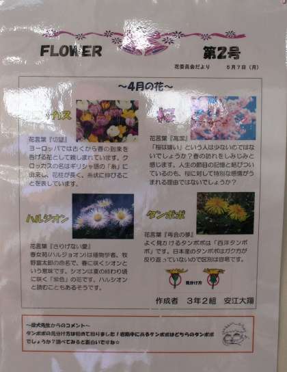 廊下に掲示された「花委員会」作成の掲示物。興味深く読めます。