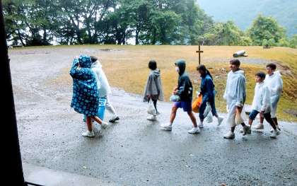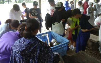 雨の中野外炊飯が始まります。