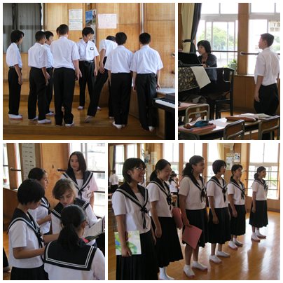 各パートの分かれて歌の練習を行い、先生に聞いてもらっています。表情を明るくしよう、ここは強く歌おう、グループでそれぞれ声を掛け合っています。