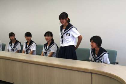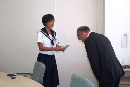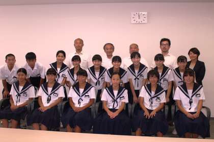 東海大会出場者 教育長表敬訪問 公開日 2018/08/01 更新日 2018/08/01 南中校長室の窓 東海大会に出場する3年生の柴田さん(陸上)、2年生の大池さん(水泳)が、岩倉中の陸上部・水泳部・剣道部・柔道部の皆さんと一緒に、市役所の長屋教育長を表敬訪問しました。 大会に臨む決意を、堂々と語ってくれました。