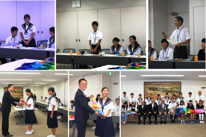 岩倉市小中学生平和祈念派遣事業 折鶴預託式 公開日 2018/08/03 更新日 2018/08/03 南中校長室の窓 平和祈念派遣事業、本年度は長崎に出かけます。 本校からは3名の生徒が参加します、 今日は、市民の方々、各小中学校から集まった「平和祈念」の折鶴を団員に託す、「折鶴預託式」が行われました。 折鶴に込められた思いをしっかりと受け止め、各自がこの事業に参加する目的と2日間の決意を堂々と語ってくれました。 気をつけて行ってらっしゃい!