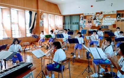 吹奏楽部の練習風景です。 休憩中の水分補給かと思いきや、空のペットボトルを加えての「吹き」「吸い」の練習でした。