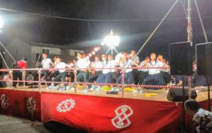 市民盆踊りが総合体育文化センター駐車場で開かれ、南部中の有志応援団が出演しました。