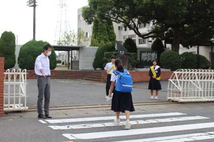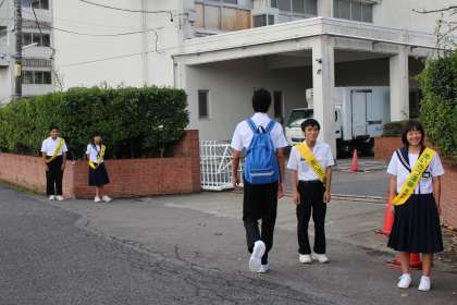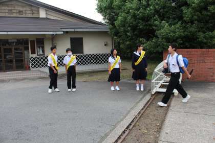 朝の挨拶運動・・・生活委員会 公開日 2018/10/01 更新日 2018/10/01 生徒会 生活委員による朝のあいさつ運動、今日が最終日です。 台風が去った後のさわやかな空気の中で、元気に取り組まれました。