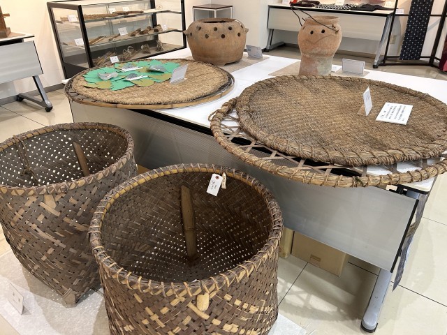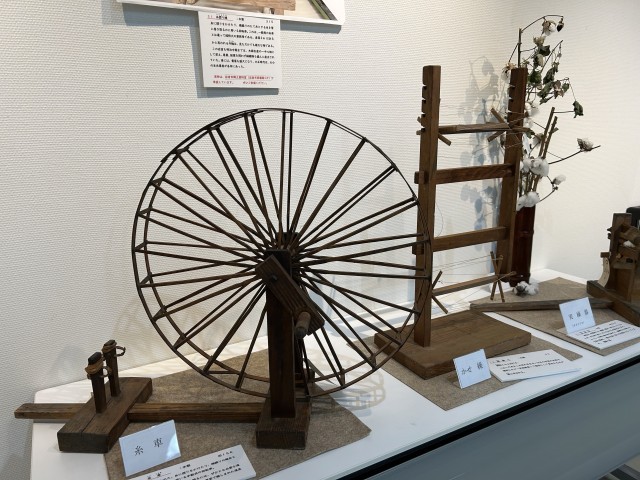 昔、綿や絹から糸を紡いだ道具などが展示されています。