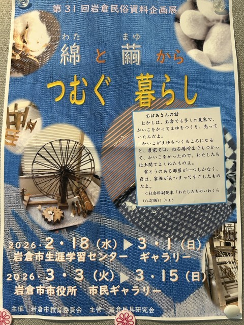 現在、生涯学習センターで、岩倉市民具研究会のお骨折りで「綿と絹からつむぐ暮らし」と題した企画展が行われています。