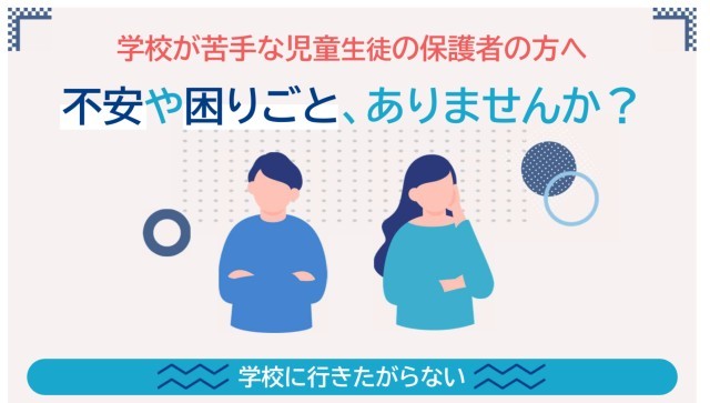 本市では「学校が苦手な児童生徒の保護者の方々へ」と題したパンフレットを本ホームページの「配布文書」に掲載しました。お子さんの様子に悩まれている保護者の方に向けて、相談できる窓口や利用できる支援などについてまとめています。